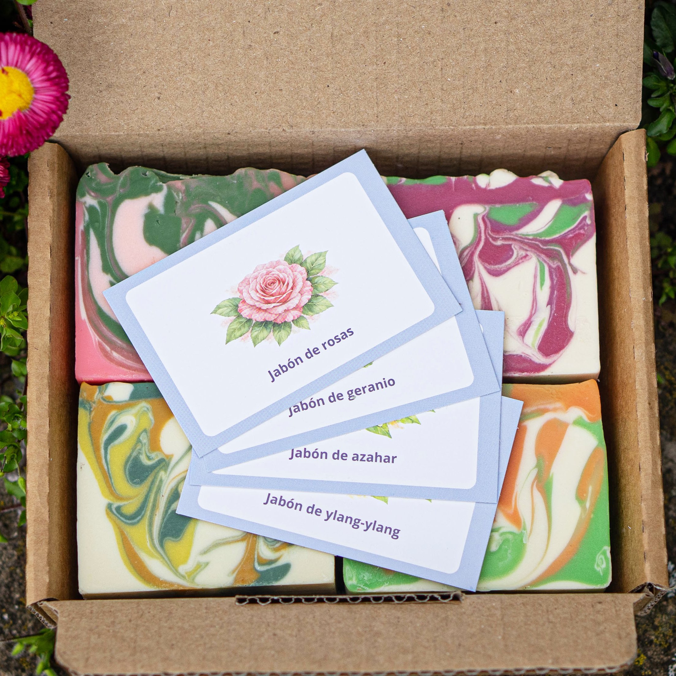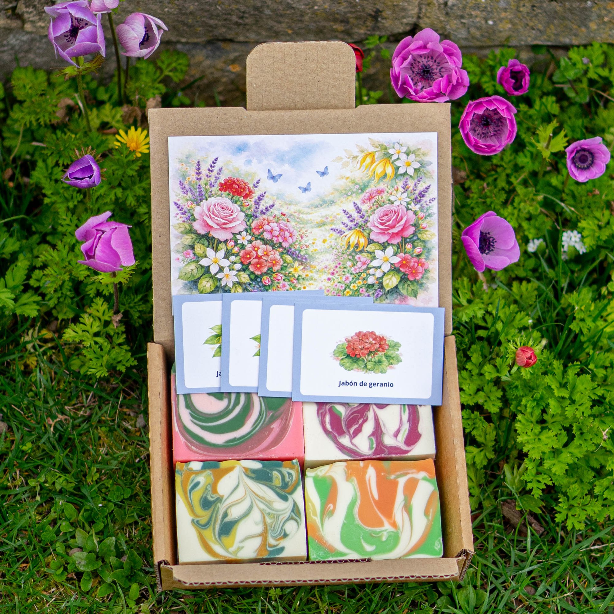El pack se presenta en una caja acompañada de ilustraciones botánicas inspiradas en las flores que dan vida a cada jabón. Una presentación pensada para que abrir la caja sea casi como abrir un pequeño jardín o un ramo de flores.